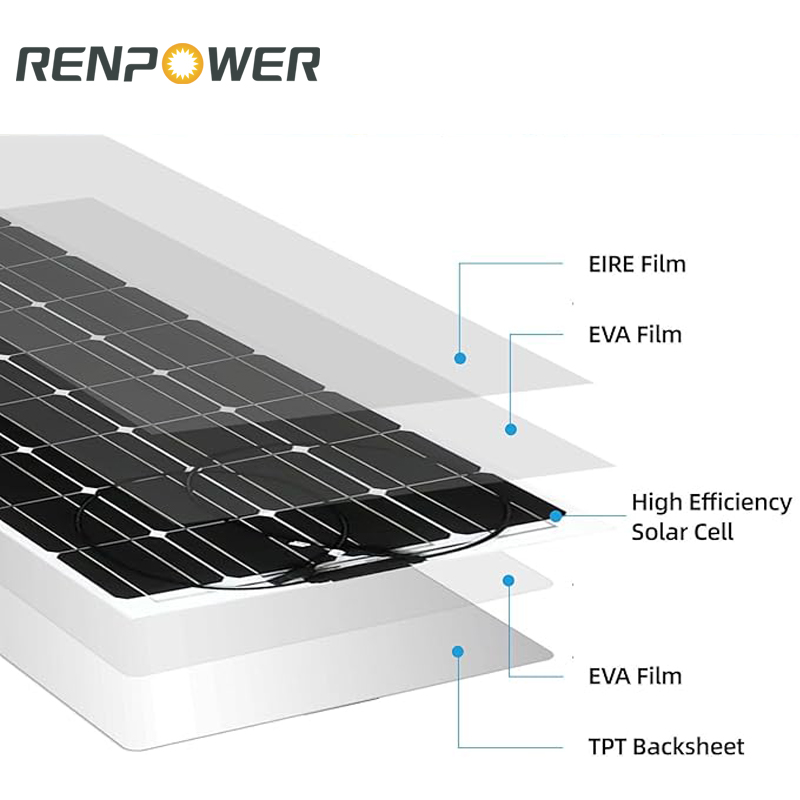 تستخدم هذه اللوحة الشمسية أحادية المرنة 230W خلايا شمسية مونو مونو بيرس عالية الكفاءة والسطح عالي الإرسال ETFE ، وهما الخلفي هو حيوان أليف عالي للماء. تحتوي مادة ETFE على انتقال أعلى للضوء وعمر خدمة أطول من المواد العادية. تضمن مواد ETFE أفضل أداء للأداء بعد يوم.